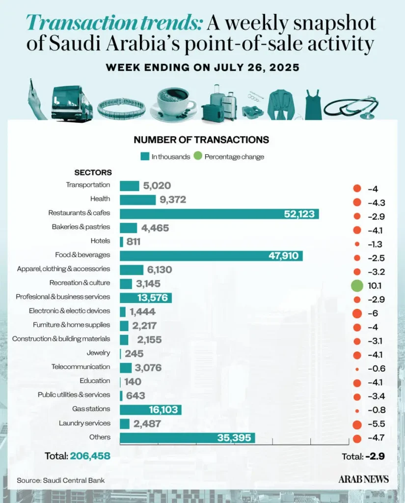 Despite the strong performance in education-related categories, overall POS transaction values declined. Total spending via POS terminals fell by 10.6 percent week on week to SR12.52 billion, while the number of transactions dropped 9.7 percent to 213.62 million.